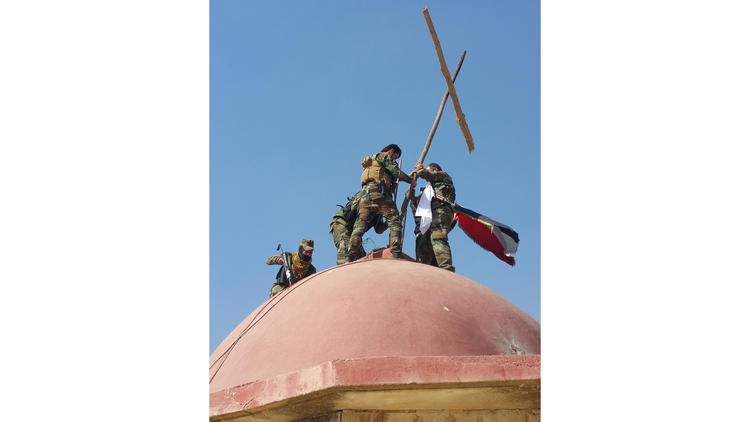 They carried it to the top of Mar Shmony, a church on the town’s eastern flank. There, ringed by counterterrorism service members who urged them to watch for sniper fire, they hoisted the cross over the church’s dome and adorned it with an Iraqi flag. One man, with a touch of ceremony, placed a nativity scene set he had fished out from the wreckage of the church at the cross’ base.